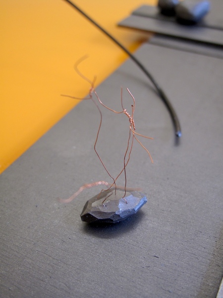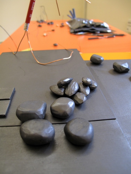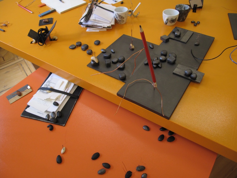 mixed media: graphite on erasers and nuts, cashews, paper, copper wire, wood, ink, graphite, pencils, shoe lace.