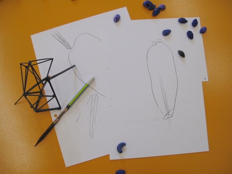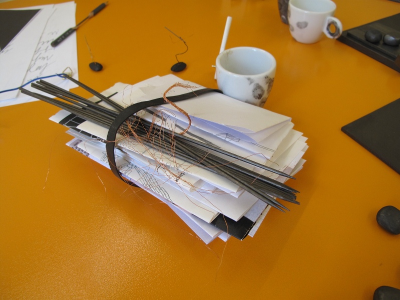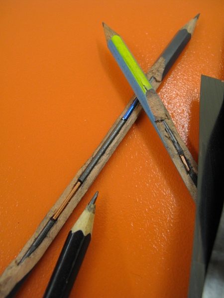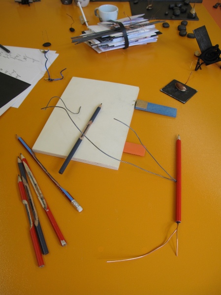 Diverse Materialien: Graphit auf Radiergummis und Nüssen, Kupferdraht, Nüsse, Holz, Tusche, Graphit, Papier, Bleistifte, Holz, Schnürsenkel.